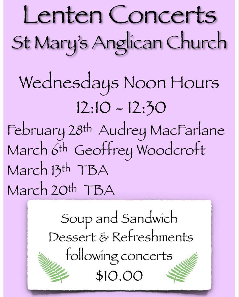 Please plan to join us for a series of Concerts on Wednesdays at 12:10. The concerts last twenty minutes after which a Soup and Sandwich Lunch is available for $10. The dates are Wednesday February 28, March 6, 13 & 20
